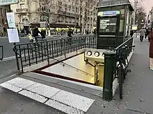 La station dispose de quatre accès répartis en cinq bouches de métro, constituées pour chacune d'un escalier fixe agrémenté d'une balustrade de style Dervaux :