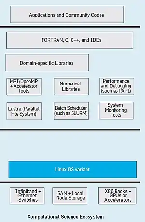 Dans les années 1980, la superinformatique vectorielle dominait l'informatique haute performance, comme en témoignent les systèmes nommés du même nom conçus par Seymour Cray. Les années 1990 ont vu la montée du traitement massivement parallèle (MPP : Massively Parallel Processing) et des multiprocesseurs à mémoire partagée (SMP : Shared Memory Multiprocessors) construits par Thinking Machines Corporation, Silicon Graphics et d'autres. À leur tour, des grappes de produits (Intel / AMD x86) et de processeurs spécialement conçus (comme BlueGene d'IBM) ont dominé les années 2000. La décennie suivante, ces clusters sont complétés par des accélérateurs de calcul sous la forme de coprocesseurs d'Intel et d'unités de traitement graphique (GPU) de Nvidia ; ils comprennent également des interconnexions à haut débit et à faible latence (comme Infiniband). Les réseaux de stockage (SAN) sont utilisés pour le stockage de données persistantes, avec des disques locaux sur chaque nœud utilisé uniquement pour les fichiers temporaires. Cet écosystème matériel est optimisé en priorité pour les performances, plutôt que pour un coût minimal. Au sommet du matériel du cluster, Linux fournit des services systèmes, complétés par des systèmes de fichiers parallèles (tels que Luster) et des planificateurs de lots (tels que PBS et SLURM) pour la gestion des travaux parallèles. MPI et OpenMP sont utilisés pour le parallélisme entre nœuds et internœuds, optimisé de bibliothèques et d'outils (tels que CUDA et OpenCL) pour une utilisation en coprocesseur. Des bibliothèques numériques (telles que LAPACK et PETSc) et des bibliothèques spécifiques au domaine complètent la pile logicielle. Les applications sont généralement développées en FORTRAN, C ou C++[17].