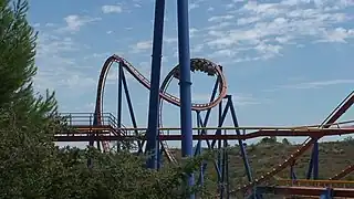 En sortant de la gare, on effectue un demi tour qui nous place sur le lift. En haut, et c'est unique chez les B&M, on enchaine pré-lift et descente droite. Ensuite on passe un loop, un immelmann, un Zero-g roll, un cobra roll, un camelback, des interlocked corkscrew et une hélix.