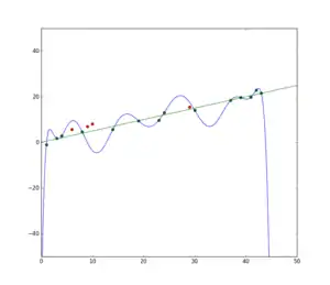 Si l'on autorise un ensemble de fonctions d'apprentissage plus grand, par exemple l'ensemble des fonctions polynomiales à coefficients réels, il est possible de trouver un modèle décrivant parfaitement les données d'apprentissage (erreur d'apprentissage nulle). C'est le cas du polynôme d'interpolation de Lagrange : il passe bien par tous les points verts mais n'a visiblement aucune capacité de généralisation.