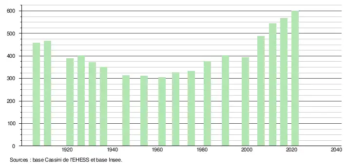 L'évolution du nombre d'habitants est connue à travers les recensements de la population effectués dans la commune depuis 1906. Pour les communes de moins de 10 000 habitants, une enquête de recensement portant sur toute la population est réalisée tous les cinq ans, les populations légales des années intermédiaires étant quant à elles estimées par interpolation ou extrapolation[23]. Pour la commune, le premier recensement exhaustif entrant dans le cadre du nouveau dispositif a été réalisé en 2006[24].