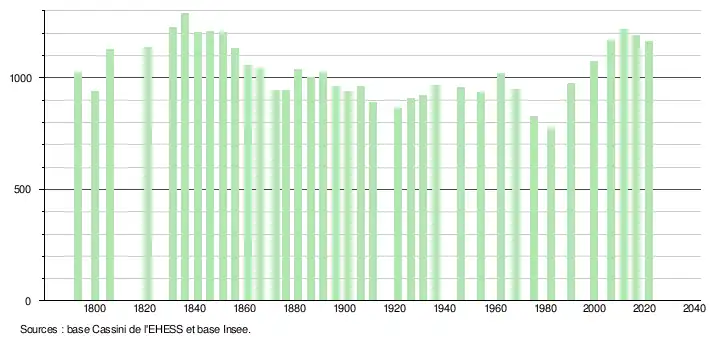 L'évolution du nombre d'habitants est connue à travers les recensements de la population effectués dans la commune depuis 1793. Pour les communes de moins de 10 000 habitants, une enquête de recensement portant sur toute la population est réalisée tous les cinq ans, les populations légales des années intermédiaires étant quant à elles estimées par interpolation ou extrapolation[28]. Pour la commune, le premier recensement exhaustif entrant dans le cadre du nouveau dispositif a été réalisé en 2006[29].