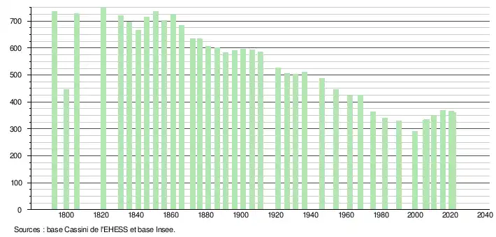 L'évolution du nombre d'habitants est connue à travers les recensements de la population effectués dans la commune depuis 1793. Pour les communes de moins de 10 000 habitants, une enquête de recensement portant sur toute la population est réalisée tous les cinq ans, les populations légales des années intermédiaires étant quant à elles estimées par interpolation ou extrapolation[28]. Pour la commune, le premier recensement exhaustif entrant dans le cadre du nouveau dispositif a été réalisé en 2005[29].