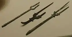 L'art présent dans les tombes de cette période consiste en quelques armes en bronze, et de nombreuses figurines en terre cuite, représentant surtout des déesses nues, diverses sculptures en métal et pierre, et des objets en roche bitumeuse[65]. On connait ainsi pour cette période plusieurs coupes en « mastic de bitume » sculpté, avec figuration d'éléments zoomorphes, dont une remarquable coupe tripode, dont les pieds ont la forme d'ibex, mise au jour dans une tombe du tell de l'Apadana[66],[26]. L'artisanat du métal de cette période produit des pièces remarquables, comme la statuette en cuivre d'un dieu, à l'origine entièrement recouverte d'or (qui ne reste qu'au niveau de sa main gauche)[67]. Cette période se traduit par l'essor du travail du bronze, aux dépens du cuivre[24].