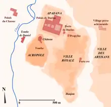 - Présentation de la topographie et des monuments de Suse à l'époque achéménide, avec une iconographie très fournie : R. Boucharlat, « Suse », sur ACHEMENET, 2013-2014