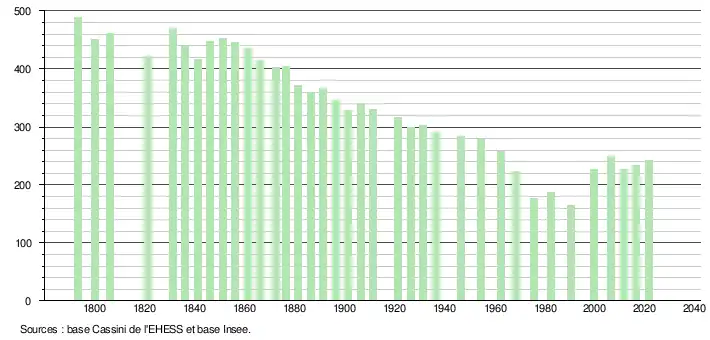 L'évolution du nombre d'habitants est connue à travers les recensements de la population effectués dans la commune depuis 1793. Pour les communes de moins de 10 000 habitants, une enquête de recensement portant sur toute la population est réalisée tous les cinq ans, les populations légales des années intermédiaires étant quant à elles estimées par interpolation ou extrapolation[19]. Pour la commune, le premier recensement exhaustif entrant dans le cadre du nouveau dispositif a été réalisé en 2006[20].