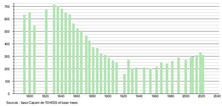 L'évolution du nombre d'habitants est connue à travers les recensements de la population effectués dans la commune depuis 1793. Pour les communes de moins de 10 000 habitants, une enquête de recensement portant sur toute la population est réalisée tous les cinq ans, les populations légales des années intermédiaires étant quant à elles estimées par interpolation ou extrapolation[14]. Pour la commune, le premier recensement exhaustif entrant dans le cadre du nouveau dispositif a été réalisé en 2008[15].