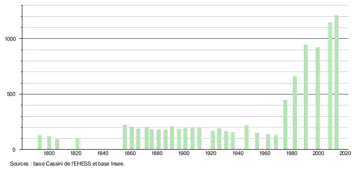 L'évolution du nombre d'habitants est connue à travers les recensements de la population effectués dans la commune depuis 1793. À partir du , les populations légales des communes sont publiées annuellement dans le cadre d'un recensement qui repose désormais sur une collecte d'information annuelle, concernant successivement tous les territoires communaux au cours d'une période de cinq ans. Pour les communes de moins de 10 000 habitants, une enquête de recensement portant sur toute la population est réalisée tous les cinq ans, les populations légales des années intermédiaires étant quant à elles estimées par interpolation ou extrapolation[6]. Pour la commune, le premier recensement exhaustif entrant dans le cadre du nouveau dispositif a été réalisé en [7],[Note 2].