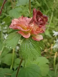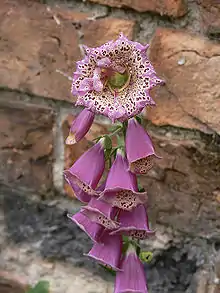 ← Pélorie sur une digitale pourpre : l'inflorescence est constituée de fleurs zygomorphes (forme normale) et d'une fleur terminale aberrante actinomorphe.