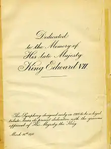 Cette symphonie conçue début 1910 pour être un hommage royal porte cette dédidace : "Avec le gracieux assentiment de Sa Majesté le Roi, le 16 mars 1911".