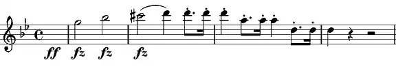 La symphonie s’ouvre sur un thème orageux en sol mineur. La triade mineure est par la suite intensifiée par la dissonance créée par le do dièse. Les rythmes pointés qui y répondent sont par la suite transformés en une fanfare.
