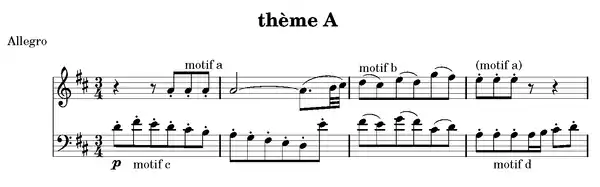 Le thème principal, que l’on appellera A, s’élance d’abord, piano, aux seconds violons, bassons et altos (motif c) puis passe aux premiers violons.