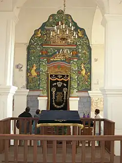 Au-dessus, sont peints deux griffons symbolisant des chérubins adorant les Tables de la Loi couronnées de l'inscription "Couronne de la Torah". La peinture polychrome contient de nombreux motifs de plantes et d'animaux.