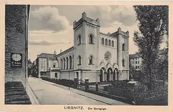 La synagogue de Liegnitz ou synagogue de Legnica, inaugurée en 1847, a été détruite en 1938 lors de la nuit de Cristal comme la plupart des autres lieux de culte juif en Allemagne.
