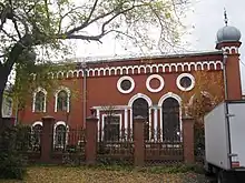 L'édifice de briques est de plan rectangulaire. La façade Est donne sur la rue Pouchkine. En son milieu, il y a une abside trièdre en saillie avec un attique au-dessus d'une frise de fausses fenêtres arquées. Les angles de cette façade sont couronnés chacun d'une petite coupole. Les fenêtres à plein cintre sont flanquées de colonnettes, et surplombées d'un oculus dont les croisillons forment une étoile de David. Sous la corniche profilée, l'édifice est orné d'une frise d'arcatures.