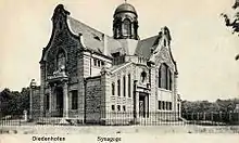 Carte postale avec l'ancienne synagogue de Thionville (vers 1920).