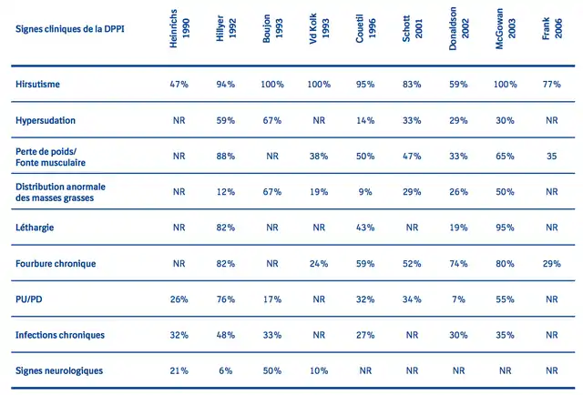 Les chevaux atteints de DPIP présentent une large variété de signes cliniques non spécifiques qui progressent avec le temps. Ces signes incluent : hirsutisme, fourbure, hypersudation, léthargie, fonte musculaire, distribution anormale des masses grasses et polyurie/polydipsie. Les signes moins souvent décrits de la DPIP sont : retard de cicatrisation, immunosuppression et sensibilité aux infections (sinusite, par ex.), lactation persistante et infertilité. Certains de ces signes peuvent être associés à tort au processus normal de vieillissement, ceux-ci apparaissant souvent de manière insidieuse. Aucun consensus n’existe actuellement sur le tableau clinique de la DPIP. Le tableau ci-dessous résume les observations décrites dans différentes publications.
