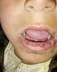 Cette maladie entraine l’apparition de taches bleu foncé à brunes, appelées macules, qui pigmentent les muqueuses (principalement sur les lèvres, les gencives, les narines, les mains et les pieds). Ces lésions cutanées, sauf pour la bouche, tendent à diminuer ou à disparaitre à la puberté.