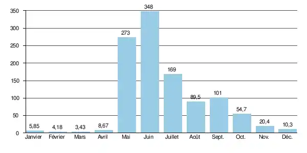 Le débit moyen mensuel observé en mars (minimum d'étiage) est de 3,43 m3/s, soit moins de 1 % du débit moyen du mois de juin (348 m3/s), ce qui souligne l'amplitude extrêmement importante des variations saisonnières. Ces écarts de débit mensuel peuvent être plus marqués encore d'après les années : sur la durée d'observation de 37 ans, le débit mensuel minimal a été de 0,62 m3/s en , tandis que le débit mensuel maximal s'élevait à 831 m3/s en .