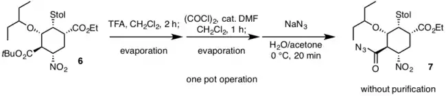 Dans la deuxième opération monotope, l'acide trifluoroacétique est utilisé en premier lieu pour déprotéger l'ester tert-butylique de 6 puis tout excès de réactif est éliminé par évaporation. L'acide carboxylique produit à la suite de cette déprotection est ensuite converti en un chlorure d'acyle par le chlorure d'oxalyle et une quantité catalytique de diméthylformamide, DMF. Enfin, l'addition d'azoture de sodium produit l'acylazoture 7 sans aucune purification[11].