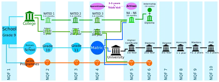 Pour l'entrée à l'université, une «approbation d'inscription» est requise, bien que certaines universités établissent leurs propres exigences académiques supplémentaires. L'Afrique du Sud a un secteur supérieur dynamique, avec plus d'un million d'étudiants inscrits dans les universités et instituts du pays. Toutes les universités sont autonomes et rendent compte à leurs propres conseils plutôt qu'au gouvernement. Le système National Qualifications Framework (NQF) d'administration de l'enseignement supérieur dans l'ensemble du pays est géré par la South African Qualifications Authority.