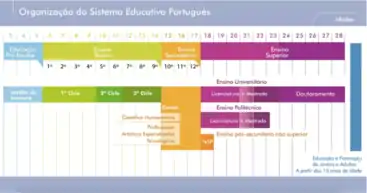 L'enseignement se divise en trois grandes parties : Ensino básico (enseignement dites "basique"/élémentaire), Ensino secundário (enseignement secondaire) et Ensino superior (enseignement supérieur).