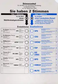 - Avec la première voix (en allemand : Erststimme ou Wahlkreisstimme), il vote en faveur d'un candidat dans sa circonscription.