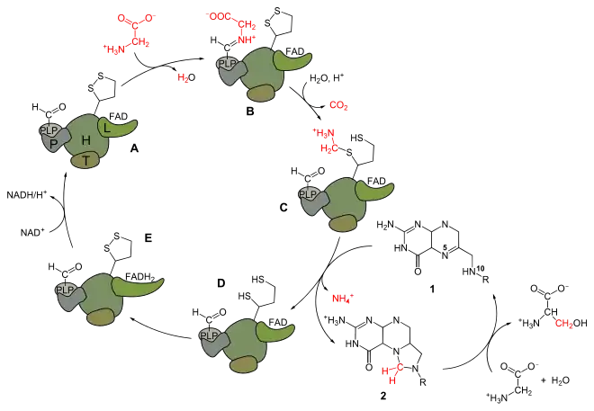 La glycine, représentée en rouge, se condense avec le GCS (A) pour former une base de Schiff (B) qui réagit avec l'acide lipoïque de la protéine H après décarboxylation (C) et libération de dioxyde de carbone CO2.