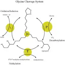 Chez l'humain et la plupart des vertébrés, le système de clivage de la glycine constitue la principale voie métabolique de dégradation de la glycine et de la sérine. Ceci provient essentiellement du fait que cette réaction produit du 5,10-méthylènetétrahydrofolate, qui constitue l'un des rares donneurs de groupes monocarbonés pour les biosynthèses[2]. Le groupe méthyle issu de la glycine peut ainsi être transféré à d'autres molécules clés telles que des purines ou la méthionine.