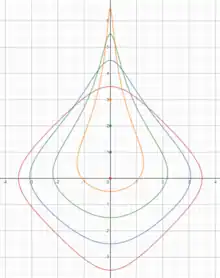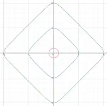 Tous les points de H, et même la plupart des points à l'infini, ont des coordonnées axiales, mais un couple de nombres (x,y) ne correspond à un point de H que si ; si , le couple correspond à un point à l'infini, et les couples tels que ne correspondent à rien. Ainsi, le système des coordonnées axiales définit une injection de H vers le plan , dont l'image (l'ensemble des points (x,y) tels que ) est une région ressemblant à une astroïde, représentée en rouge ci-contre.