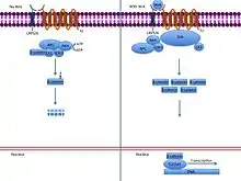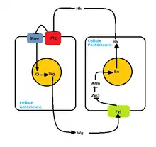 En parallèle, dans les cellules exprimant le signal Hedgehog par le facteur de transcription Engrailed, il y a de même une autre cascade de signalisation de Wingless avec l'activation d'un complexe de protéines appelées Dishevelled, Zeste-white3 et Amardillo considérées comme des gènes de polarité segmentaire chez la Drosophile[9].