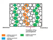 La communication cellulaire produite par Wingless (Wg) et Engrailed (En) impliquent aussi l’induction de récepteurs. de protéines sécrétées et accessoires par leurs facteurs de transcription pour délimiter le patron des segments avec l’aide d’un ensemble de gènes comme Hedgehog, Patched, Frizzled. Au cours de la gastrulation, Wingless et Engrailed deviennent dépendantes de leur expression[6]. Ce système permet de réguler l'expression de ces gènes et de maintenir le réseau de polarité segmentaire pour la différenciation des cellules formant le front d'un parasegment jusqu'à l'arrivée des gènes homéotiques.