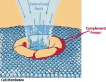 Le C3b, qui est le plus grand fragment de la lyse de C3 par la C3-convertase, se lie de façon covalente à la surface de la cellule. Le plus petit fragment, C3a, agit quant à lui comme signal diffusible qui provoque une réponse inflammatoire, en stimulant la migration des globules blancs vers le site de l'infection. Le fragment C3b fixé à la membrane, produit à la fois par la voie classique et la voie alterne, et même la voie des lectines, amorce la cascade des réactions qui conduit à la formation du complexe d'attaque membranaire, à partir des composants tardifs du complément. Il est donc fixé sur la membrane de façon covalente, et il clive le facteur C5 en C5a et C5b. C5b reste faiblement lié à C3b et s'assemble rapidement à C6 et C7 pour former le complexe C5b67 qui va s'ancrer à la membrane via C7. Ce complexe lie ensuite C8, pour former le complexe C5b678. La liaison du facteur C9, qui expose une région hydrophobe après changement de conformation, entraîne son insertion dans la membrane plasmique de la cellule. Il s'ensuit alors une réaction en chaîne où les C9 de nouvelle conformation vont lier des C9 de l'ancienne, entraînant le changement conformationnel qui leur permet de s'insérer dans la double couche lipidique. C'est ainsi qu'il se forme un canal au travers de la membrane cellulaire (Complexe d'attaque membranaire (CAM)). Dès lors, la perméabilité de la cellule est perturbée, les petites molécules pénètrent et sortent de la cellule au voisinage de ces pores, et à travers ceux-ci. Les macromolécules ne peuvent cependant pas passer. De ce fait, le mécanisme cellulaire contrôlant l'équilibre des échanges est bouleversé. L'eau entre par osmose dans la cellule, faisant augmenter son volume jusqu'à la lyse. On observe ce même phénomène de lyse avec des globules rouges en solution hypotonique. Ce système est très efficace puisqu'il a été observé que la présence d'un seul de ces canaux permet la lyse d'un globule rouge.