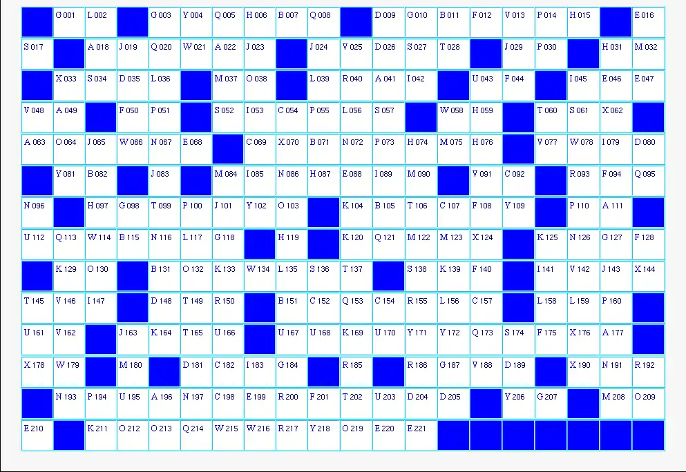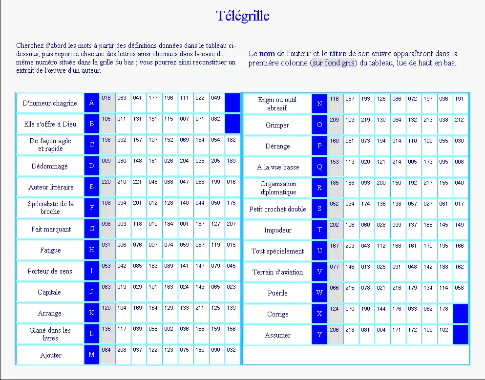 Explication : si l'on pense que le mot correspondant à la définition "Porteur de sens" (située à la ligne "I" du tableau des définitions) est "EXPRESSIF", on va pouvoir reporter les lettres E, X, P, R, E, S, S, I et F aux emplacements de la grille dont les numéros respectifs sont : 053, 042, 085, 183, 089, 141, 147, 079 et 045, ce qui va nous donner :
