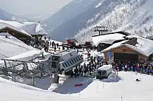 Vue en 2013 de l'arrivée de la télécabine de 1986 avec au premier plan le départ du télésiège des Autannes.