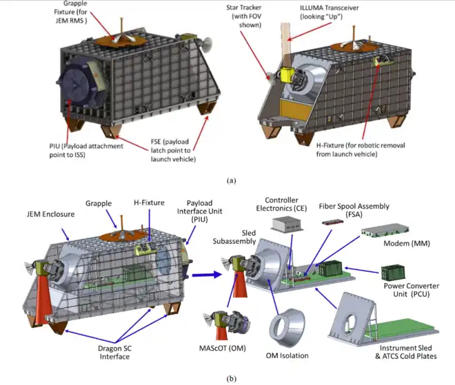 - ILLUMA-T (Integrated LCRD Low-Earth Orbit User Modem and Amplifier Terminal) est un terminal de télécommunications laser installé en 2023 à bord de la Station spatiale internationale. Il est conçu pour communiquer avec le LCRD installé à bord d'un satellite géostationnaire avec un débit de 1,2 gigabits par seconde. L'ensemble constitué par le LCRD et ILLUMA-T forme le premier système de télécommunications permettant une communication optique de bout en bout via un satellite relais géostationnaire[23].