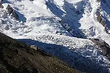 Depuis le glacier des Bossons avec l'aiguille du Midi au centre et le pylône intermédiaire à gauche.