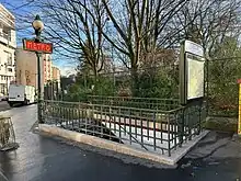 La station dispose de quatre accès, les trois d'origine étant constitués d'un escalier fixe orné d'une balustrade et d'un candélabre de style Dervaux :