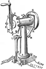 Contrairement aux autres télégraphes à aiguilles, la force motrice qui fait tourner les aiguilles n'est pas fournie par le courant électrique de la ligne télégraphique. Elle est fournie par un mécanisme d'horlogerie qui doit être maintenu remonté. Les manipulateurs de remontage sont accrochées à des chaînes de chaque côté de la face de l'instrument. Il y a un manipulateur et un mécanisme séparés pour chaque aiguille. Lorsque l'on souhaite remonter le mécanisme, le manipulateur est attaché à un enrouleur carré situé directement sous chaque aiguille. Lorsque le courant est appliqué à l'une des lignes télégraphiques, le cran du mécanisme d'horlogerie correspondant est libéré au moyen de l'induit d'un électroaimant et l'aiguille avance de 45°. Lorsque le courant est coupé, la détente est à nouveau libérée et l'aiguille avance de 45° supplémentaires[15]. Le courant est appliqué à la fois à l'instrument émetteur et récepteur, de sorte que l'opérateur émetteur puisse voir la transmission qui en résulte[16].