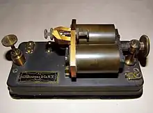 En 1825, le physicien anglais William Sturgeon a inventé l'électroaimant, avec un seul enroulement de fil non isolé sur un morceau de fer verni, qui augmentait la force magnétique produite par le courant électrique. L'Américain Joseph Henry l'a amélioré en 1828 en plaçant plusieurs enroulements de fil isolé autour de la barre, créant ainsi un électroaimant beaucoup plus puissant qui pouvait faire fonctionner un télégraphe malgré la résistance élevée des longs fils télégraphiques[18]. Au cours de son séjour à l'Albany Academy (en) de 1826 à 1832, Henry a démontré pour la première fois la théorie du « télégraphe magnétique » en faisant sonner une cloche à travers un fil de 1,6 km tendu autour de la pièce en 1831[19].