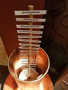 Le modèle grec ancien a été décrit au IVe siècle av. J.-C. par Énée le Tacticien dans son ouvrage Poliorcétique[2] puis au IIIe siècle av. J.-C. par l'historien Polybe, qui a retrouvé ce texte perdu[3]. Selon ce dernier, il a été utilisé pendant la première guerre punique pour envoyer des messages entre la Sicile et Carthage.[réf. nécessaire]