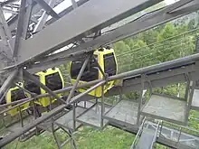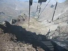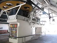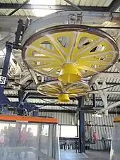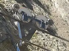 ![]() Chariot de roulement des cabines, avec le câble porteur (au-dessus) et le câble tracteur (au-dessous). - 31/08/2009 |