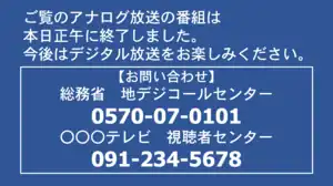 Les émissions de télévision terrestre analogique au Japon devaient se terminer le 24 juillet 2011, conformément à la loi japonaise actuelle sur la radiodiffusion. Cependant, le basculement est retardé dans les préfectures de Fukushima, Miyagi et Iwate, en raison du désir de permettre aux personnes les plus impactées par le tremblement de terre et le tsunami de Tōhoku en 2011 et la catastrophe nucléaire de Fukushima qui suit. Dans ces régions, la diffusion analogique prend fin le 31 mars 2012.