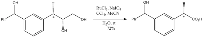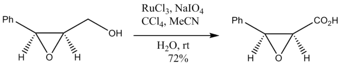 RuO4 est un oxydant particulièrement énergique : il faut veiller à ce que les conditions opératoires soient douces, généralement à température ambiante. Les centres stéréogènes qui ne sont pas oxydés sont cependant préservés, comme l'illustre l'oxydation ci-dessous d'un diol en acide carboxylique :