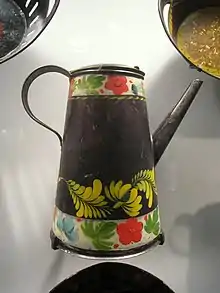 Les objets utilitaires ont constitué, un domaine privilégié pour les fabricants de tôle peinte. On retrouve ainsi des aiguières, des cendriers, des soupières et des cafetières en tôle peinte[1].