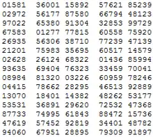 Une table de nombres aléatoires est un ensemble de nombres disposés en rangées et en colonnes qui ne présentent aucun lien statistique prédictible, quelle que soit la façon dont on les extrait de la table.