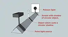 Poisson étudia la théorie de Fresnel en détail et, en tant que partisan de la théorie corpusculaire de la lumière, chercha un moyen d'en démontrer la fausseté. Poisson crut la trouver dans une conséquence de la théorie de Fresnel selon laquelle une tache claire devait se former au centre de l'ombre portée par un corps opaque exactement circulaire, alors que selon la théorie corpusculaire de la lumière, cette ombre devait être uniforme sur tout un disque. Trompé par l'absence de taches de Fresnel dans les ombres de la vie quotidienne, Poisson pensait avoir établi l'absurdité des hypothèses de la théorie de Fresnel[9].