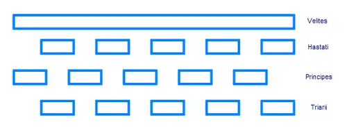 L'infanterie romaine se déployait face à l'ennemi et à l'époque de la République, elle se déployait en trois lignes dans une formation appelée « triplex acies », chacune d'entre elles avait généralement huit rangs en profondeur. Les hastati formaient la première ligne (la plus proche de l'ennemi), les principes tenaient la deuxième ligne et les vétérans triarii occupaient la troisième ligne. Ceux-ci empêchaient la panique ou une retraite non autorisée des premiers rangs et étaient parfois utilisés comme réserve dans la bataille. En cas de défaite imminente, les première et deuxième lignes se reformaient derrière la ligne des triarii en vue d'une contre-attaque ou d'une retraite ordonnée. Comme recourir aux triarri n'arrivait que dans les cas extrêmes, l'expression latine ad triarios rediisse (tomber sur les triarii) signifiait une situation désespérée[7].
