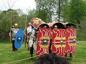 - Au commandement Repellere equites (« repousser les cavaliers »), les légionnaires se disposaient en carré tenant leurs pila comme des lances entre leurs boucliers et se tenaient épaule contre épaule.