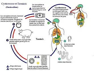 Dans certains cas l'homme devient l'hôte intermédiaire de T. solium et héberge alors les larves cysticerques. L'infestation se fait par ingestion accidentelle d'embryophores (souillure alimentaire ou auto-infestation). Chez l'homme, les larves cysticerques ont un « tropisme » différent de celui observé chez le porc ; Des cysticerques peuvent s'enkyster dans tous les organes du corps humain. Ils ciblent d'abord « les tissus sous cutanés, les muscles de la langue, du cou et du thorax, ainsi que les muscles orbitaires et l'œil, et le cerveau (cortex, ventricule, espace sous arachnoïdien) »[3]. Une grande partie des larves ne vont pas rester dans le tissu musculaire mais vont migrer dans le cerveau (60 % des cas) ou encore dans la région proche des yeux.